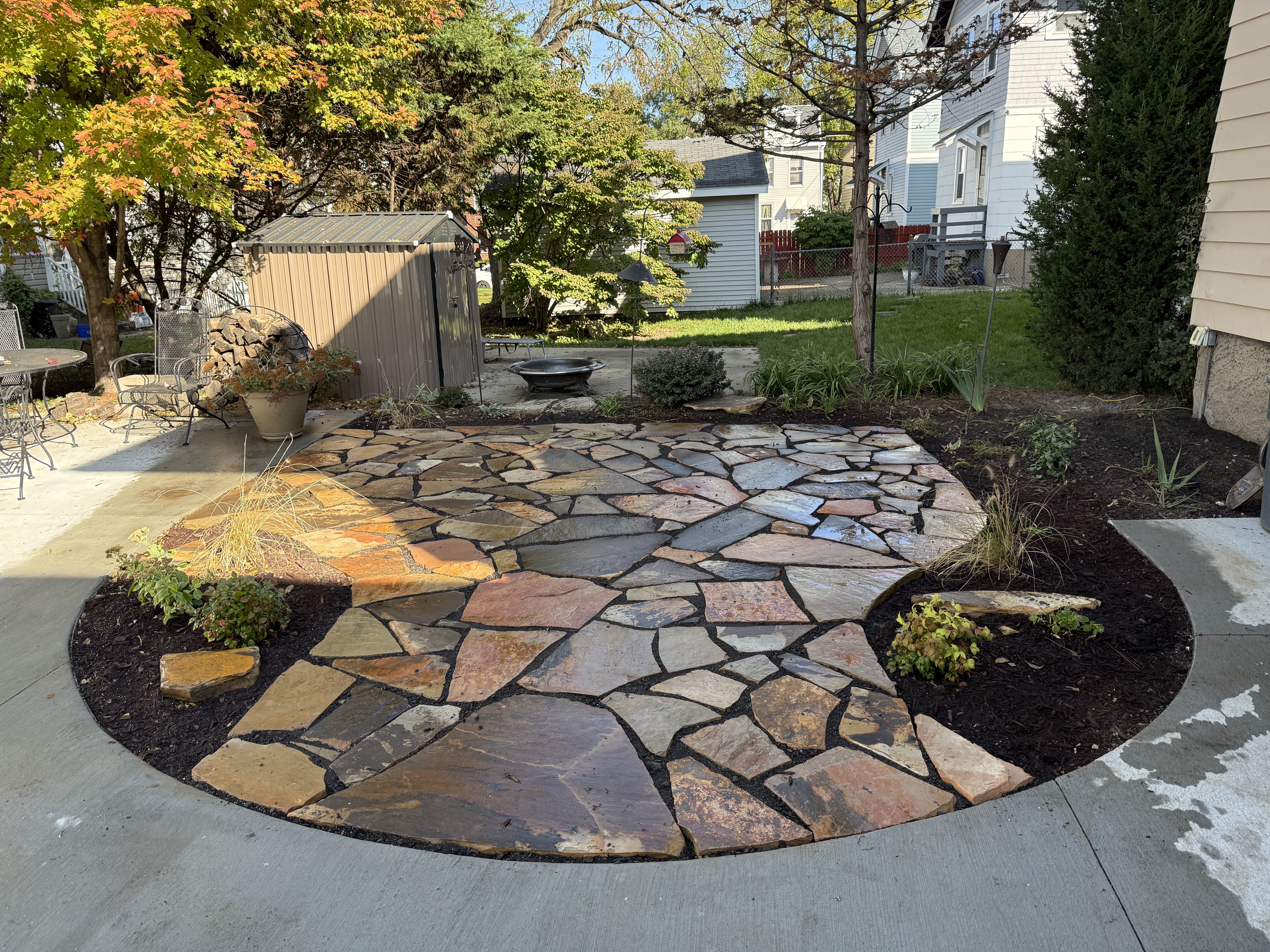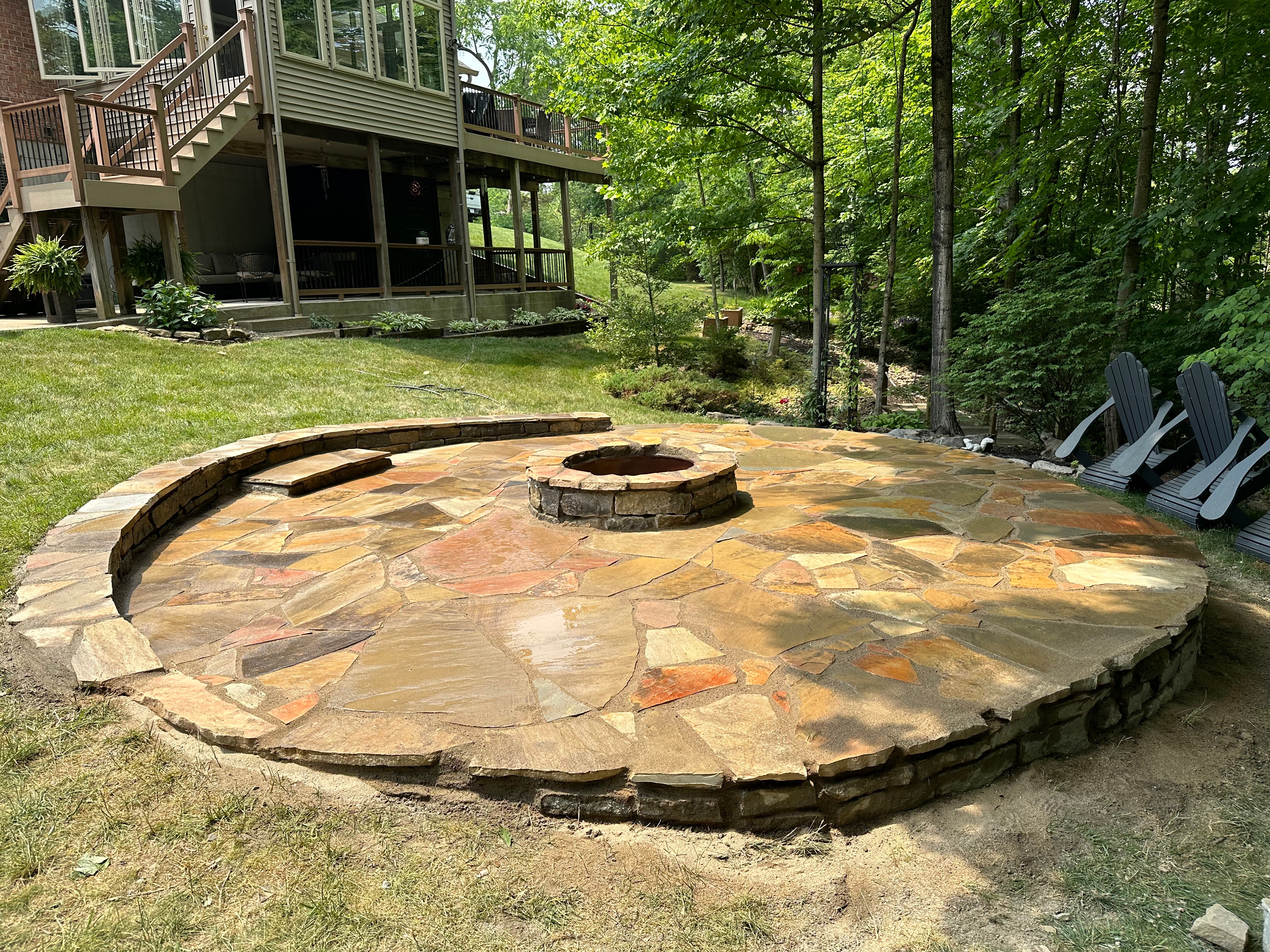 This project included a full patio install using natural stone, custom layout planning, and integrated seating. Designed to create a clean, usable outdoor space that feels intentional and built to last.